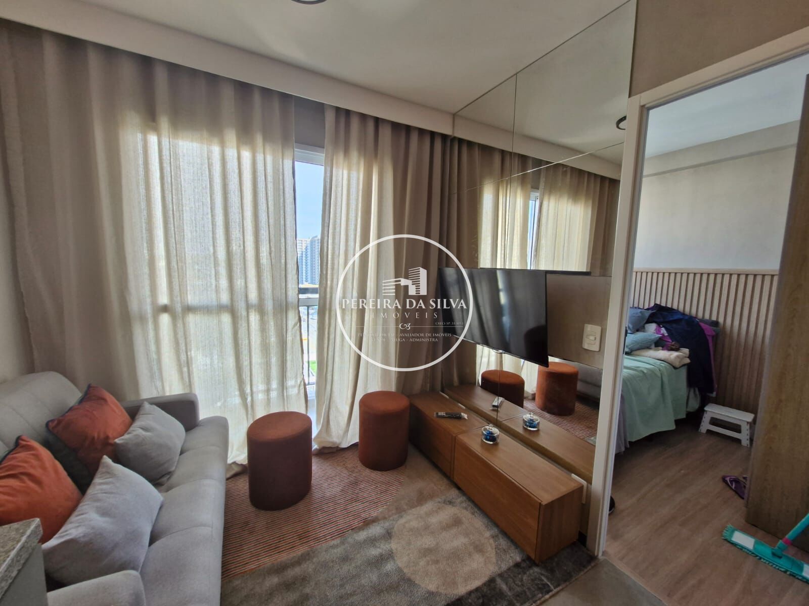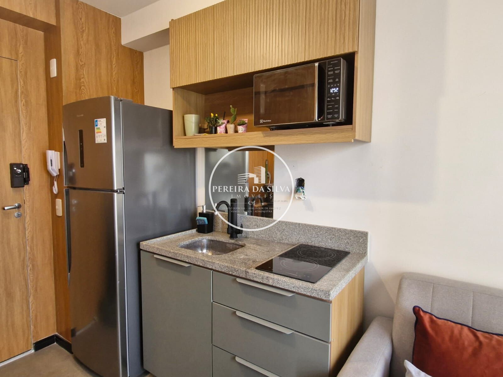 Apartamento com 24m² distrbuídos em 1 dormitório com banheiro, cozinha americana com área de serviço, sala com sacada, sem vaga de garagem.