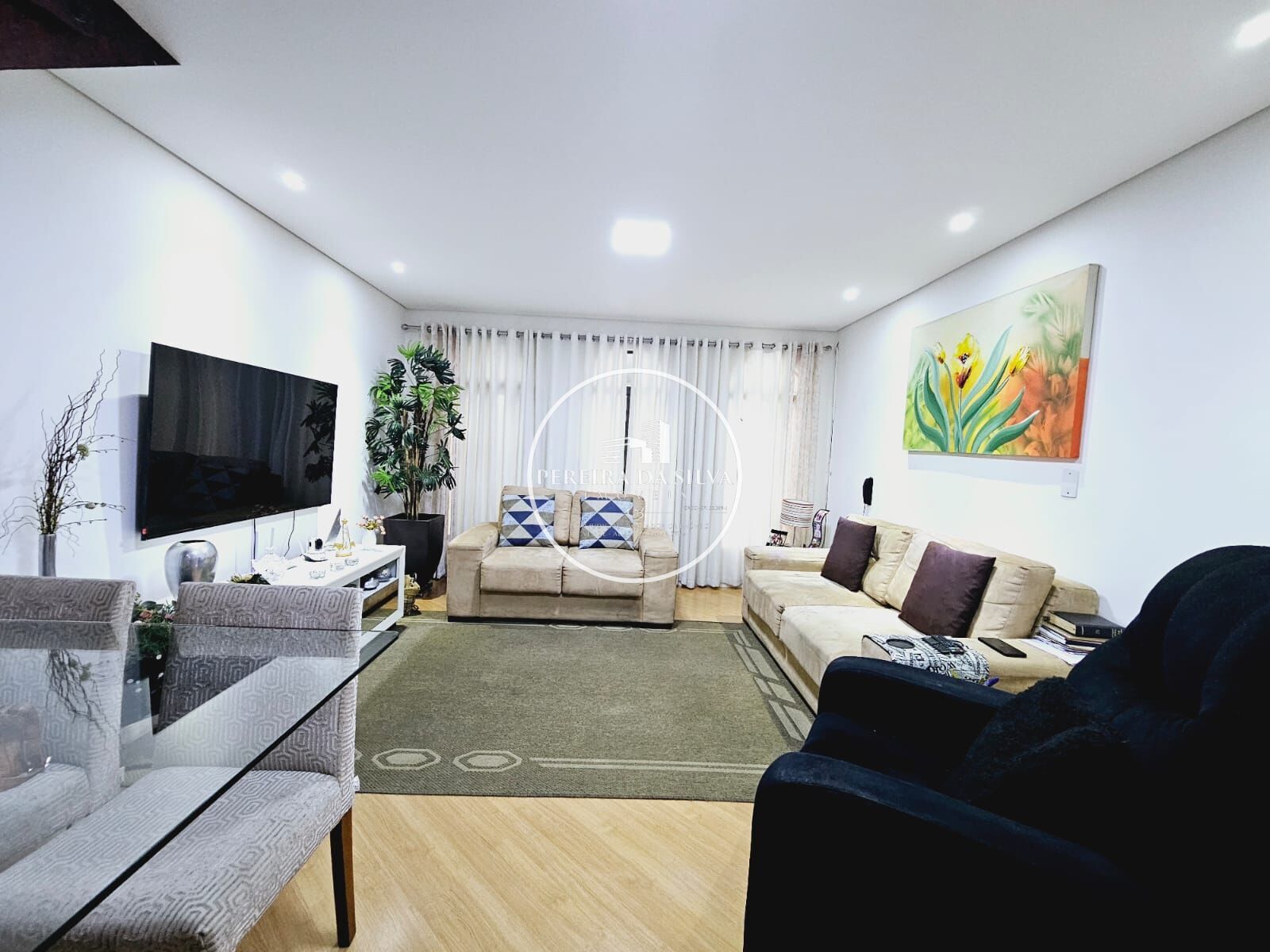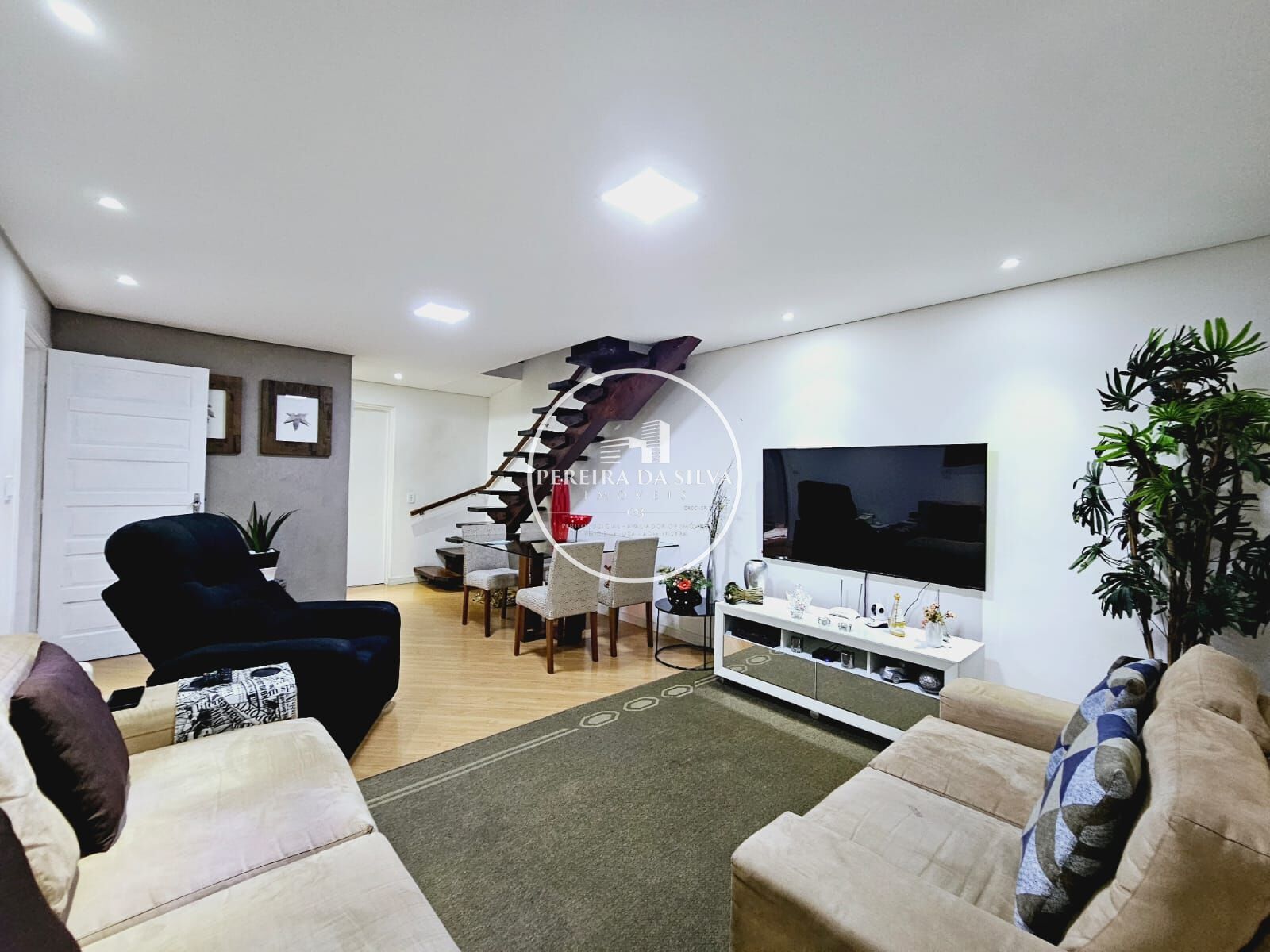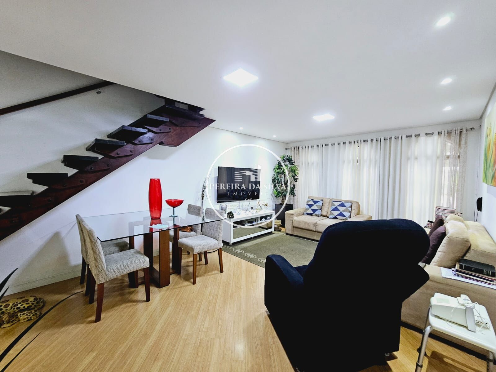 Sobrado com distribuídos em 3 dormitórios, varanda, 1 banheiro, lavabo, sala de estar, sala de jantar, cozinha, área de serviço coberta, área com churrasqueira, corretor lateral, garagem para 4 vaga.